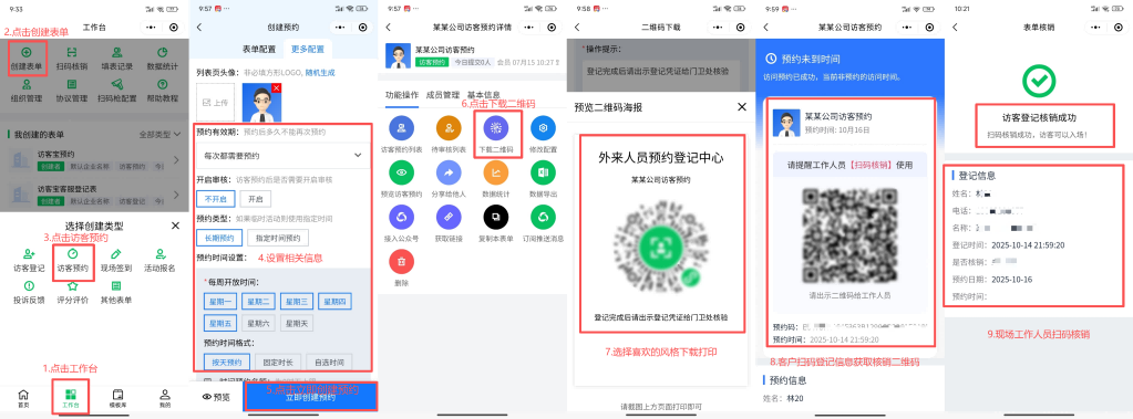 步骤2: 点击工作台→创建表单→选择 “访客预约” 类型。