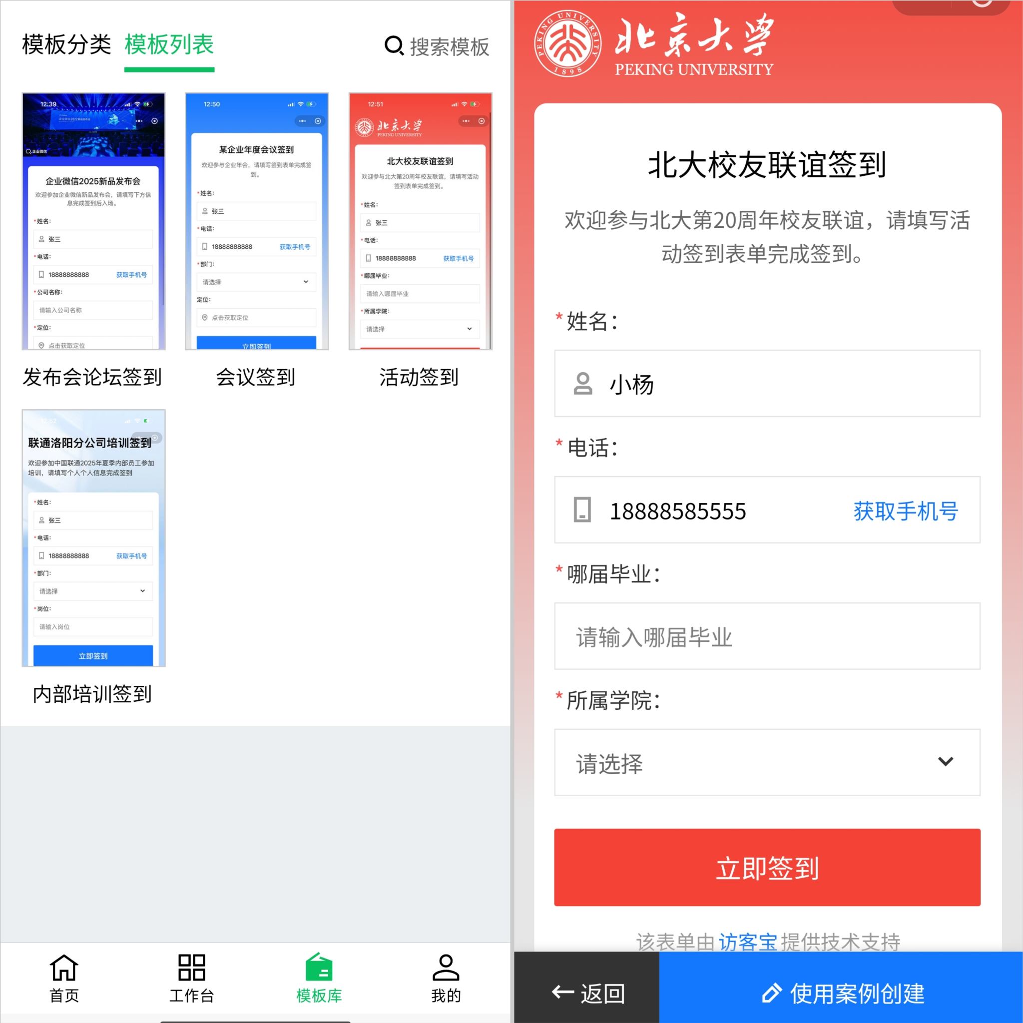 访客宝小程序配备了各类场景的签到模板,无需发布人浪费时间手动创建了,直接选择一款合适的模板简单修改一键复用即可,系统会为您生成专属的现场扫码签到二维码.